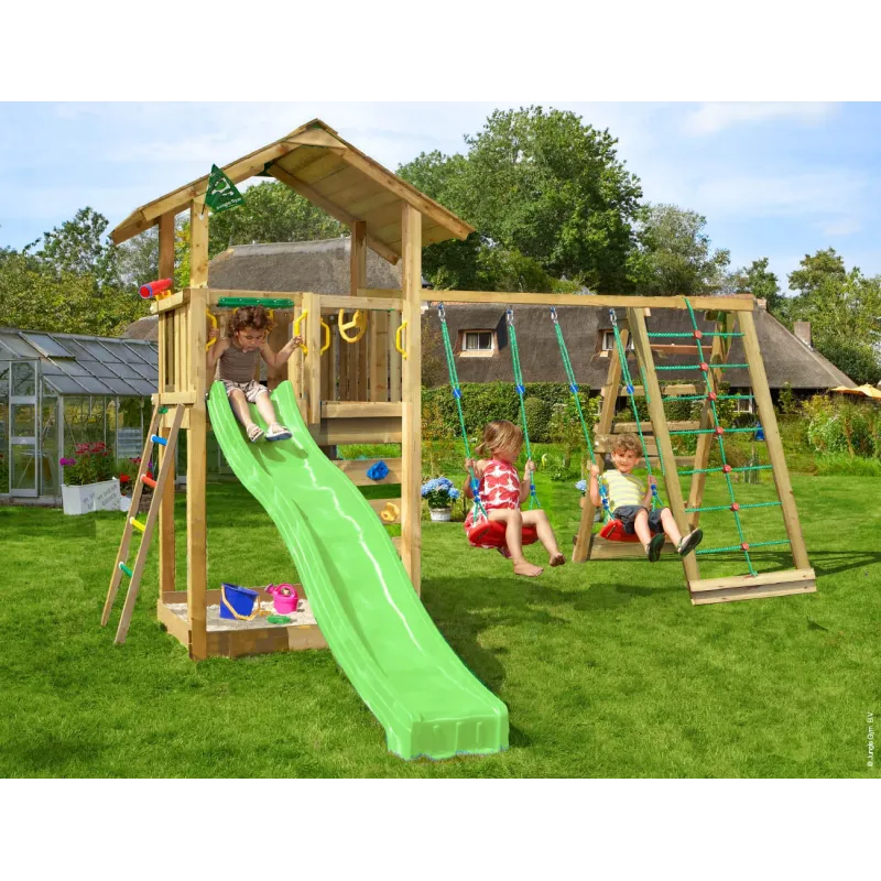 Jungle Gym Sierra legetårn komplet inkl. klatremodul og grøn rutschebane 804-291CXGJungle Gym Sierra kan godt minde om spændende eventyr i en række tilstødende bjerge. Tårnet har en interessant opbygning med mange muligheder for tilbygninger med Jungle Gy