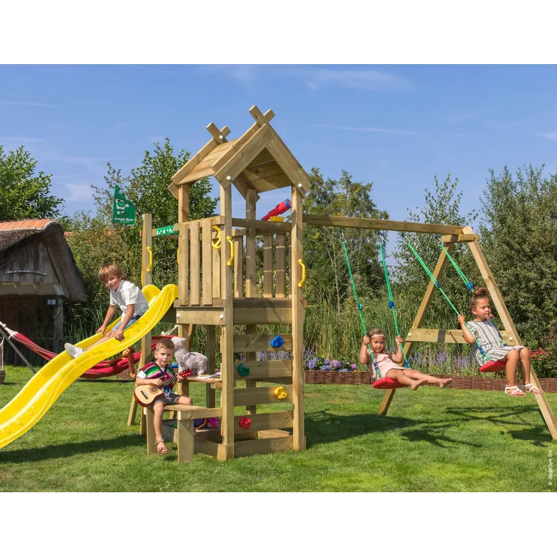 Jungle Gym Teepee legetårn komplet inkl. gyngemodul og gul rutschebane 804-088S2GUHyggeligt og holdbart, dine små vil føle sig hjemme i Jungle Teepee 2-gyngemodul. Dette kompakte klatrestativ til børn stjæler showet, ikke haven. Søg ly på legepladsen, nåe