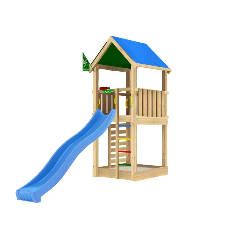 Legetårn komplet Jungle Gym Lodge 2. 1 inkl. blå rutschebaneJungle Gym Lodge er et legetårn i mellemstørrelse med en åben struktur, hvor der også er adgang til platformen ad den fastmonterede stige. Den skønne lodge kan indlogere mange gæster og tilbyde d