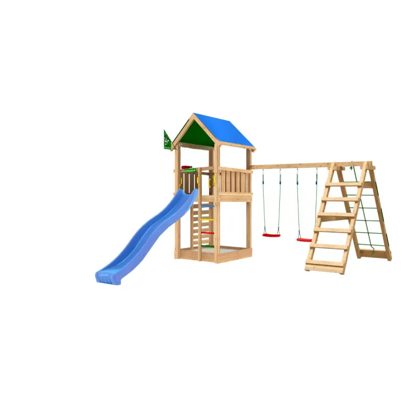 Legetårn komplet Jungle Gym Lodge 2. 1 inkl. Climb Module og blå rutschebaneJungle Gym Lodge er et legetårn i mellemstørrelse med en åben struktur, hvor der også er adgang til platformen ad den fastmonterede stige. Den skønne Lodge kan indlogere mange gæs
