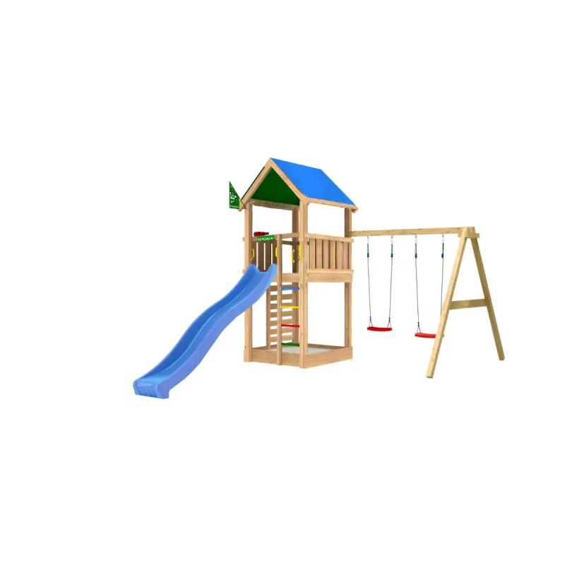 Legetårn komplet Jungle Gym Lodge 2. 1 inkl. Swing Module og blå rutschebaneJungle Gym Lodge er et legetårn i mellemstørrelse med en åben struktur, hvor der også er adgang til platformen ad den fastmonterede stige. Den skønne lodge kan indlogere mange gæs